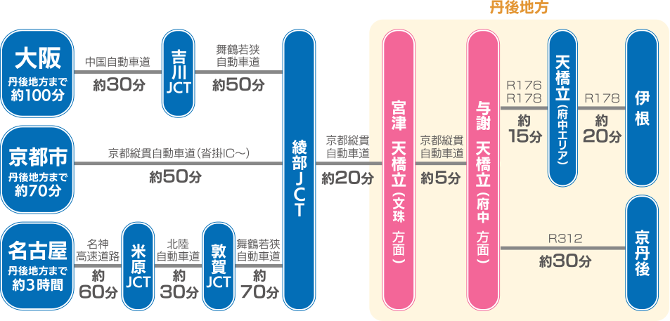 ・丹海高速バス 京都駅⇔天橋立、大阪⇔天橋立で運行されている高速バスです。ネット予約・電話予約もできます。 ・鉄道(JR) JR京都駅、JR大阪駅から天橋立への鉄道情報です。下車後の二次交通についても紹介しております。