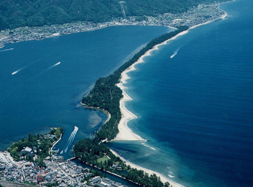 天橋立は幅は約20~170m・全長約3.6kmの砂州に約5000本もの松が茂っている珍しい地形で、その形が、天に架かる橋のように見えることから『天橋立』の名が付きました。 その何千年もの歳月をかけて自然がつくりだした神秘の造形を見ようと、たくさんの旅行者が訪れます。