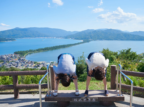 成相山中腹にある公園で、天橋立を北側から一望できる展望所です。 ここからの眺めは、天橋立が昇り龍のように見えることから「昇龍観」と呼ばれています。天橋立を股の間からのぞくと天地が逆転したように見える「股のぞき」発祥の地としても有名。