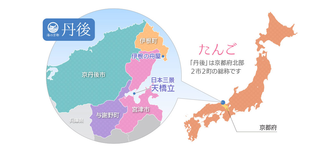 宮津市、与謝野町、伊根町、京丹後市、舞鶴市、福知山市、綾部市の5市2町で構成される京都府北部の観光圏「海の京都」にあって、古くから「丹後地方」と呼ばれる当地には目の前に日本三景天橋立を有し、舟屋で知られる伊根町へは車で約30分のところで毎年大勢の旅行者にお越しいただいております。